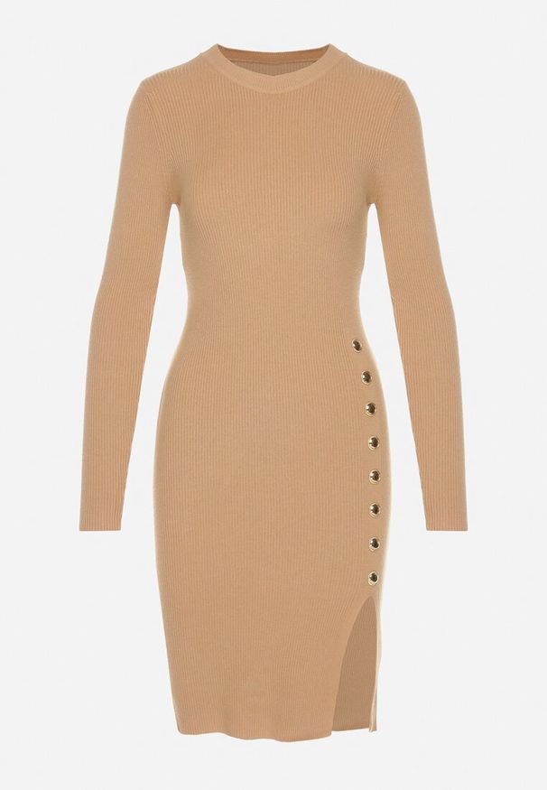 Born2be - Beżowo-Pomarańczowa Sukienka Rozkloszowana z Kopertowym Dekoltem i Gumką w Pasie Emrra. Okazja: na co dzień, na plażę. Typ kołnierza: dekolt kopertowy. Kolor: beżowy. Materiał: tkanina. Sezon: lato. Typ sukienki: kopertowe. Styl: casual