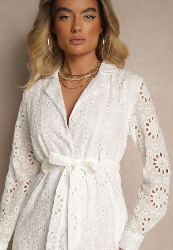 Renee - Biała Ażurowa Sukienka Mini z Odkrytymi Plecami i Głębokim Dekoltem Azani. Kolor: biały. Materiał: dzianina. Wzór: ażurowy. Długość: mini