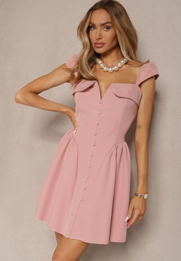 Renee - Różowa Mini Sukienka o Dopasowanym Fasonie z Hiszpańskim Dekoltem Callacia. Kolekcja: petite. Kolor: różowy. Typ sukienki: dopasowane. Styl: klasyczny. Długość: mini