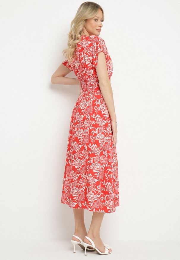 Born2be - Beżowo-Czerwona Wiskozowa Sukienka o Rozkloszowanym Kroju z Wiązaniem przy Dekolcie i Gumką w Talii Wicia. Okazja: na co dzień, na spacer, na imprezę. Kolor: beżowy. Materiał: wiskoza. Sezon: lato. Styl: casual, wakacyjny, elegancki