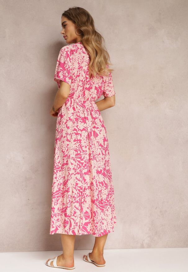 Renee - Biało-Różowa Sukienka z Gumką w Talii z Trójkątnym Dekoltem w Kwiatowy Wzór Nellvia. Okazja: na co dzień, na imprezę. Kolor: biały. Wzór: kwiaty. Sezon: lato. Typ sukienki: proste. Styl: casual, elegancki