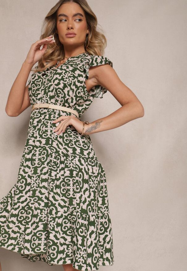 Renee - Zielona Sukienka w Stylu Boho z Gumką w Talii i Ozdobnym Wiązaniem Piofara. Okazja: na co dzień. Typ kołnierza: dekolt w serek. Kolor: zielony. Typ sukienki: rozkloszowane. Styl: boho