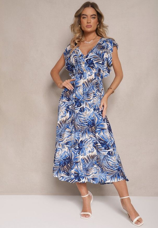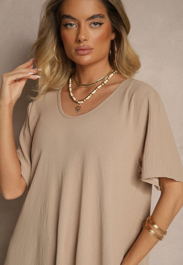 Renee - Jasnobeżowa Sukienka z Bawełną Rozkloszowana w Kwiatowy Print z Dekoltem Łódką Annirna. Okazja: na co dzień, na randkę. Typ kołnierza: dekolt w łódkę. Kolor: beżowy. Wzór: kwiaty, nadruk. Typ sukienki: rozkloszowane. Materiał: bawełna. Długość rękawa: krótki rękaw. Sezon: wiosna, lato. Styl: casual, elegancki