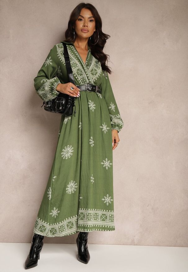 Renee - Zielona Sukienka z Ozdobnymi Falbankami Folanne. Okazja: na co dzień, na spacer, na imprezę. Typ kołnierza: kołnierz z falbankami. Kolor: zielony. Materiał: jeans. Sezon: lato. Typ sukienki: proste. Styl: casual, elegancki