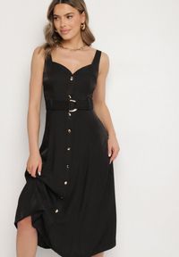 Renee - Czarna Dzianinowa Sukienka Rozkloszowana Longsleeve z Wiskozą i Paskiem Tusnira. Okazja: na co dzień. Kolor: czarny. Materiał: wiskoza, dzianina. Długość rękawa: długi rękaw. Typ sukienki: proste. Styl: casual, elegancki