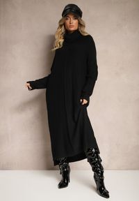 Renee - Czarna Taliowana Sukienka z Usztywnionymi Ramionami Ozdobiona Wycięciem Arfedi. Okazja: na co dzień, na spotkanie biznesowe, na imprezę. Kolor: czarny. Wzór: aplikacja. Sezon: jesień. Typ sukienki: oversize. Styl: biznesowy, casual, elegancki