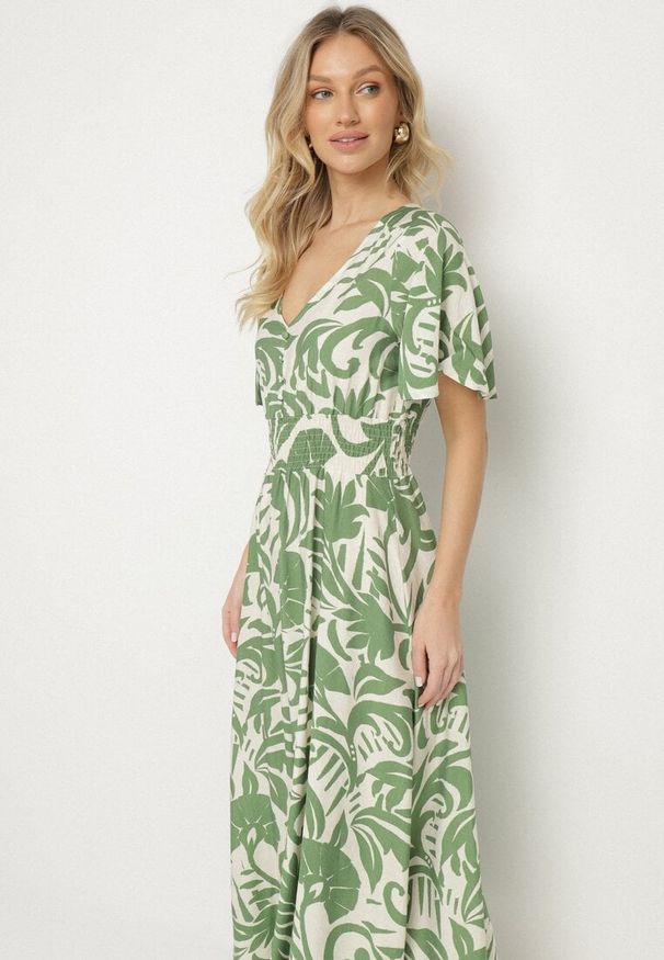 Renee - Zielono-Biała Sukienka z Gumkami na Plecach Ściągana w Talii z Regulowanymi Ramiączkami Falora. Okazja: na co dzień. Kolor: zielony. Długość rękawa: na ramiączkach. Sezon: wiosna, lato. Styl: casual, elegancki