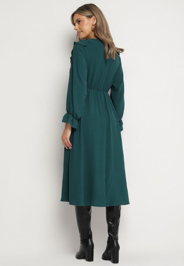 Born2be - Ciemnozielona Trapezowa Sukienka w Kwiaty Ozdobiona Aplikacjami 3D Guzikami i Paskiem Estinella. Okazja: na co dzień. Kolor: zielony. Wzór: aplikacja, kwiaty. Typ sukienki: trapezowe. Styl: klasyczny, casual, elegancki