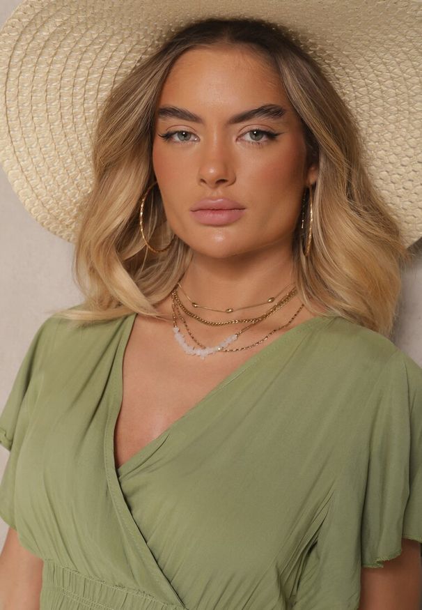 Renee - Zielona Kopertowa Sukienka Midi z Wiązanym Paskiem i Metaliczną Nitką Armellia. Okazja: na co dzień. Kolor: zielony. Typ sukienki: kopertowe. Styl: casual, elegancki. Długość: midi