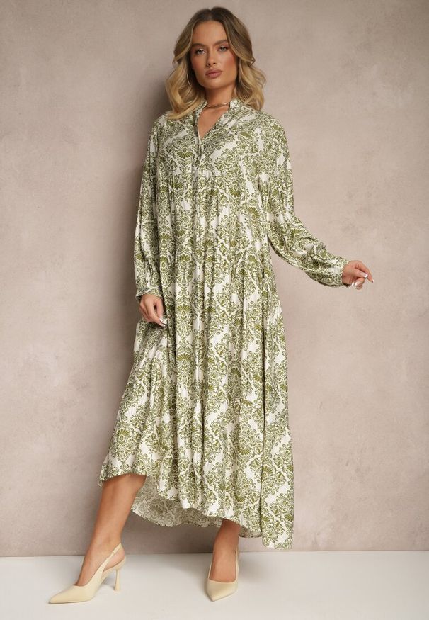 Numoco - Długa Sukienka z Falbankami na Ramionach - Zielona. Typ kołnierza: kołnierz z falbankami. Kolor: zielony. Materiał: poliester, elastan. Długość: maxi