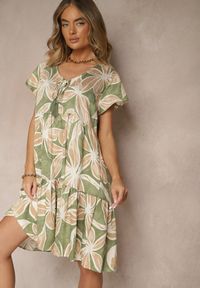Renee - Jasnozielona Rozkloszowana Sukienka Kopertowa z Kwiatowym Wzorem Mareal. Okazja: na co dzień, na imprezę. Typ kołnierza: dekolt w serek. Kolor: zielony. Materiał: bawełna. Wzór: kwiaty. Sezon: lato. Typ sukienki: kopertowe. Styl: casual, elegancki