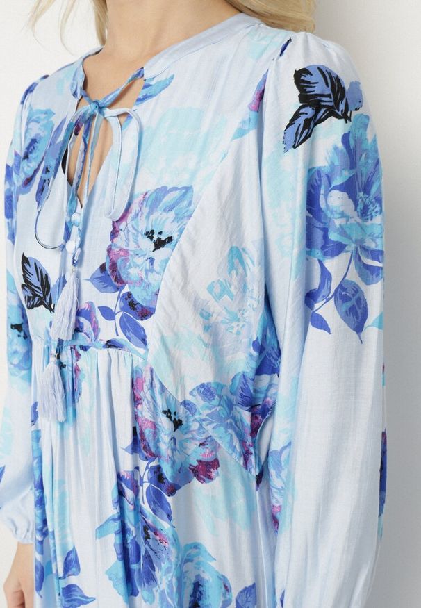 Renee - Niebieska Sukienka z Wiskozą o Rozkloszowanym Kroju w Abstrakcyjny Print Ridirinda. Okazja: na co dzień. Typ kołnierza: dekolt w serek. Kolor: niebieski. Materiał: wiskoza. Długość rękawa: długi rękaw. Wzór: nadruk. Styl: klasyczny, casual, elegancki