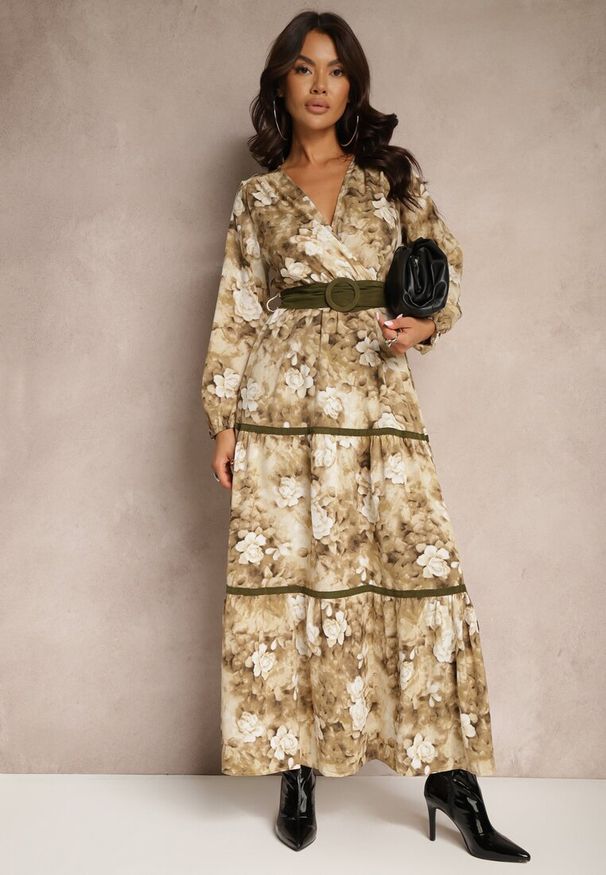 Renee - Brązowa Kopertowa Sukienka z Wiskozą z Wiązanym Paskiem w Talii Fezalia. Kolekcja: plus size. Kolor: brązowy. Materiał: wiskoza. Typ sukienki: kopertowe. Styl: elegancki
