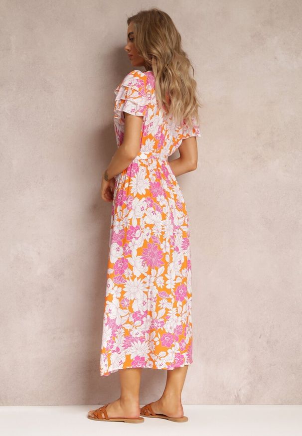 Renee - Zielono-Beżowa Sukienka Nolwyn. Kolor: zielony. Materiał: wiskoza. Wzór: kwiaty. Sezon: lato. Typ sukienki: asymetryczne, kopertowe. Długość: midi