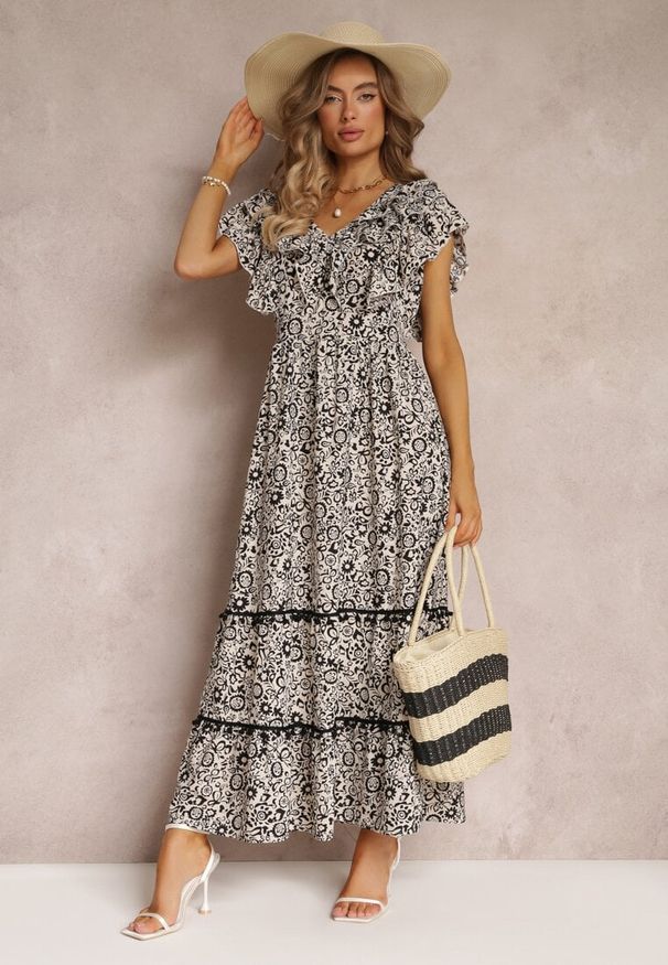 Renee - Beżowa Wiskozowa Sukienka Maxi z Pomponami i Gumką w Talii Belmona. Kolor: beżowy. Materiał: wiskoza. Wzór: aplikacja. Sezon: wiosna, lato. Długość: maxi