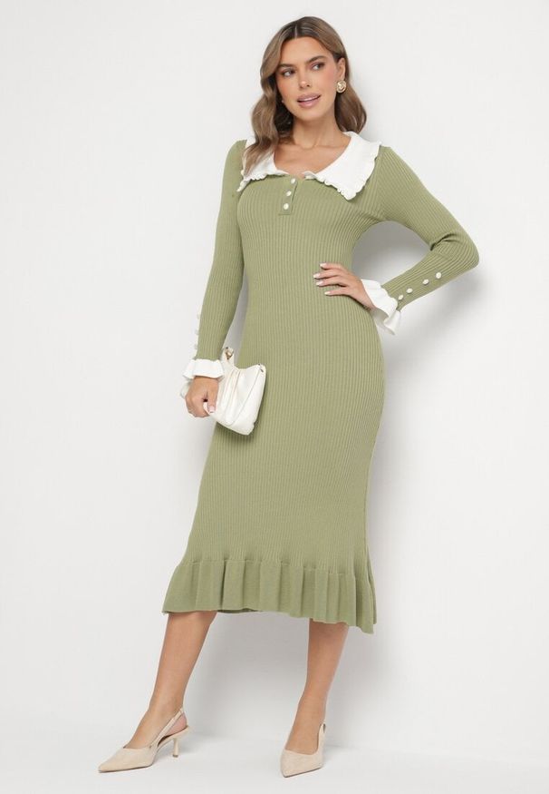 Born2be - Zielona Sukienka z Wiskozy Yorgebius. Kolor: zielony. Materiał: wiskoza. Wzór: aplikacja. Typ sukienki: rozkloszowane. Styl: wizytowy, klasyczny. Długość: midi
