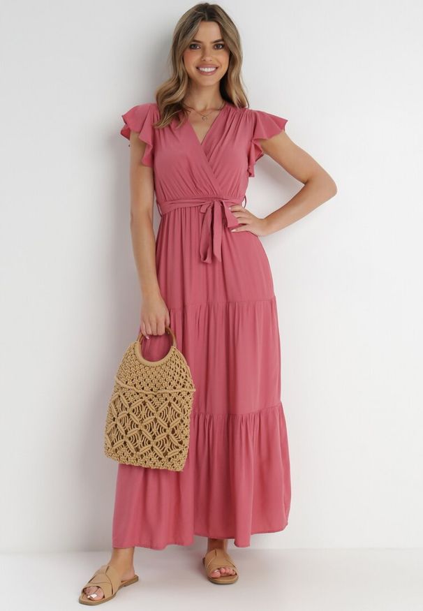 Renee - Różowa Sukienka Hesena. Typ kołnierza: dekolt kopertowy. Kolor: różowy. Wzór: paisley. Typ sukienki: kopertowe. Materiał: materiał. Długość rękawa: bez rękawów. Sezon: wiosna, lato. Styl: boho. Długość: midi