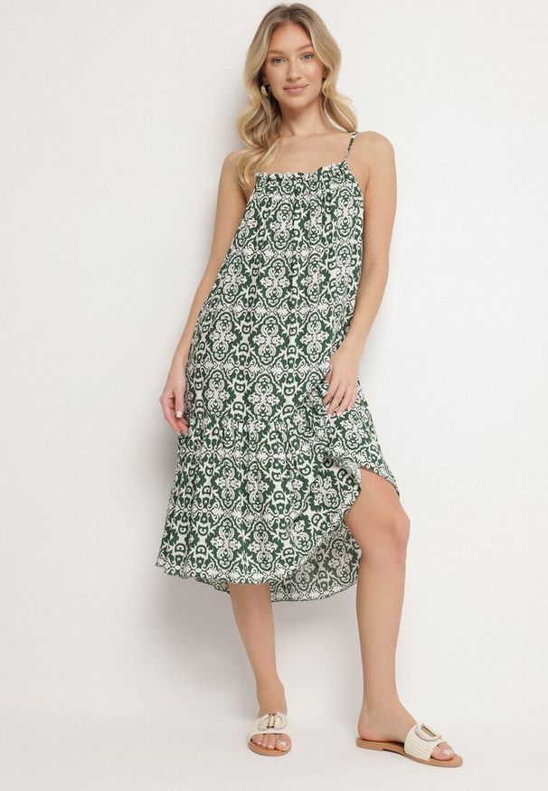 Renee - Biało-Zielona Sukienka z Bawełny na Ramiączkach z Gumką w Pasie i Ozdobnym Rozcięciem na Nogę Dimrrou. Okazja: na spacer, na plażę. Typ kołnierza: dekolt kwadratowy. Kolor: biały. Materiał: bawełna. Długość rękawa: na ramiączkach. Sezon: lato. Styl: wakacyjny, elegancki