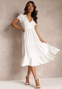 Renee - Jasnobeżowa Koktajlowa Sukienka bez Rękawów z Ozdobnymi Perełkami i Falbankami Hilalia. Okazja: na randkę. Typ kołnierza: kołnierz z falbankami. Kolor: beżowy. Materiał: materiał. Długość rękawa: bez rękawów. Wzór: aplikacja. Styl: wizytowy