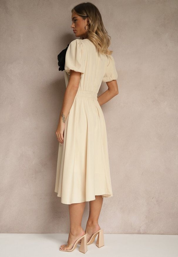 Renee - Beżowa Sukienka Midi Bez Rękawów z Drapowaniem i Wycięciem na Plecach Blita. Okazja: na co dzień. Kolor: beżowy. Długość rękawa: bez rękawów. Typ sukienki: dopasowane. Styl: klasyczny, casual. Długość: midi