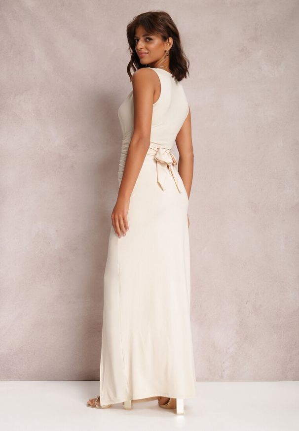 Born2be - Beżowa Sukienka Koszulowa z Wiązanym Paskiem Farima. Kolor: beżowy. Materiał: materiał, tkanina. Wzór: aplikacja, nadruk. Typ sukienki: koszulowe. Długość: midi