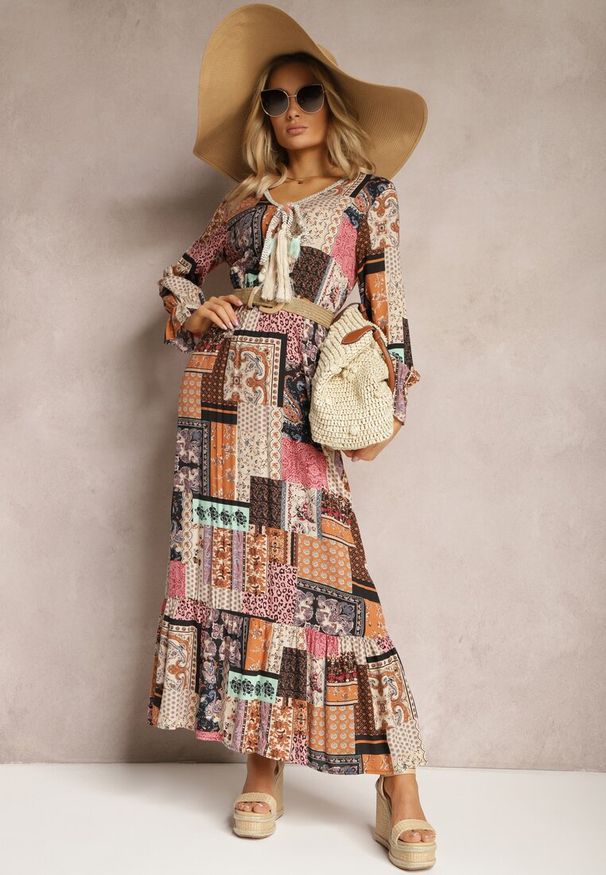 Renee - Beżowo-Różowa Sukienka Midi z Gumką w Talii i Falbanką Besslia. Kolor: beżowy. Długość: midi