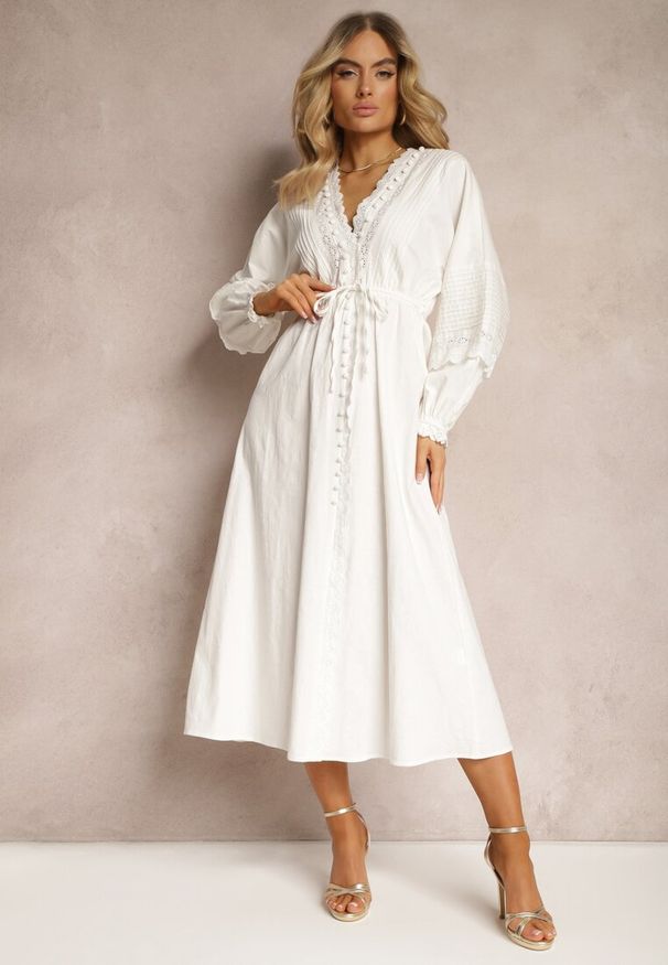 Renee - Biała Bawełniana Sukienka Koszulowa z Guzikami i Materiałowym Paskiem Wykończona Koronką Satala. Okazja: na co dzień. Typ kołnierza: dekolt w serek. Kolor: biały. Materiał: koronka, bawełna, materiał. Wzór: koronka. Typ sukienki: koszulowe. Styl: klasyczny, casual
