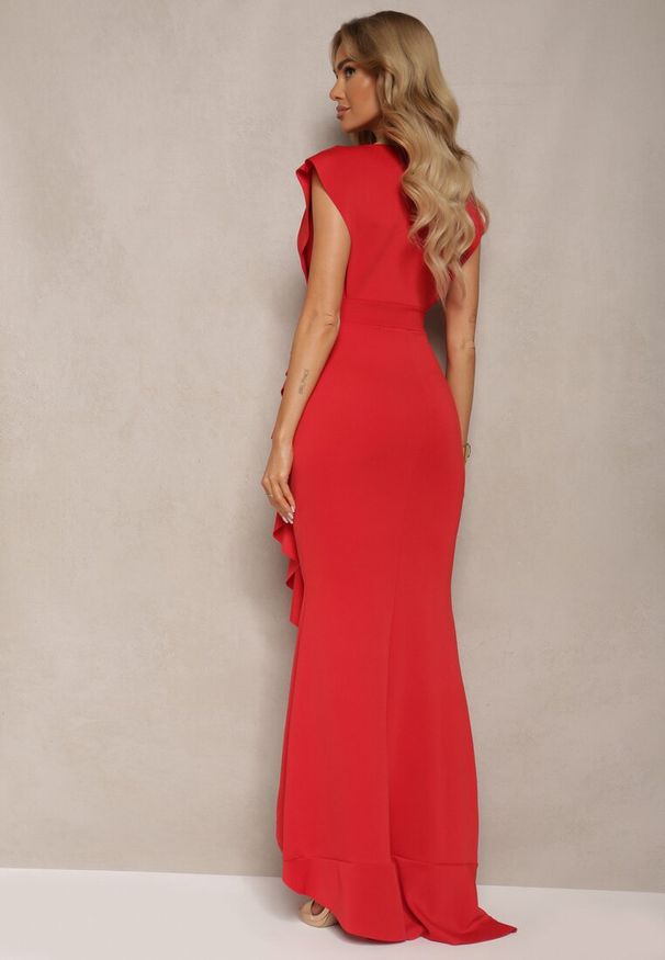 Born2be - Czerwona Sukienka Maxi Dopasowana z Poduszkami w Ramionach i Rozcięciem na Boku Ocrana. Okazja: na imprezę, na ślub cywilny, na wesele. Kolor: czerwony. Typ sukienki: dopasowane. Styl: klasyczny, elegancki. Długość: maxi