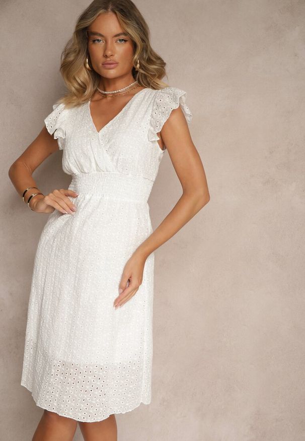 Renee - Biała Koszulowa Sukienka z Ażurowej Bawełny Wiązana w Talii Lulilena. Okazja: na spacer. Kolor: biały. Materiał: bawełna. Długość rękawa: krótki rękaw. Wzór: ażurowy. Sezon: lato. Typ sukienki: koszulowe. Styl: elegancki