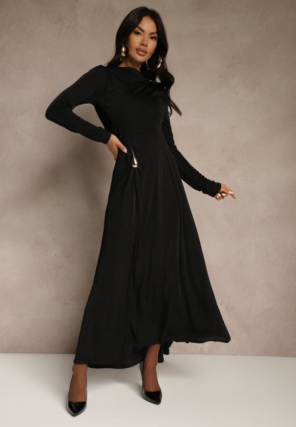 Renee - Czarna Wieczorowa Sukienka Asymetryczna na Jedno Ramię z Trenem i Metaliczną Nicią Emivonia. Kolor: czarny. Typ sukienki: asymetryczne. Styl: wizytowy