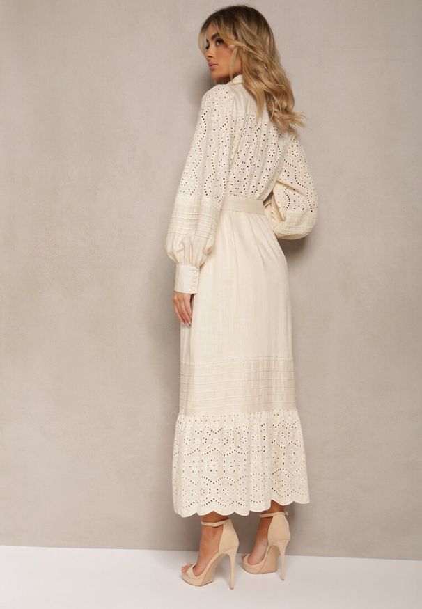 Renee - Beżowa Koszulowa Sukienka Zapinana na Guziki z Ozdobnymi Wycięciami w Pasie i Marszczeniem Tavlea. Okazja: na spotkanie biznesowe. Kolor: beżowy. Materiał: wiskoza. Typ sukienki: koszulowe. Styl: elegancki, biznesowy, klasyczny