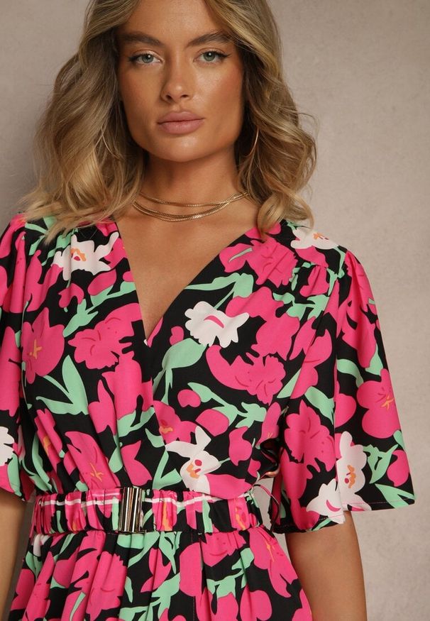Born2be - Fuksjowa Sukienka Maxi w Kwiaty z Guzikami i Materiałowym Paskiem Kinzey. Okazja: na co dzień, na imprezę. Typ kołnierza: dekolt w serek. Kolor: różowy. Wzór: kwiaty. Typ sukienki: rozkloszowane. Materiał: materiał. Sezon: lato. Styl: casual, elegancki. Długość: maxi
