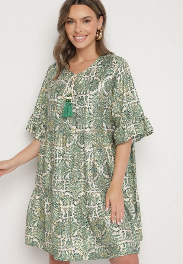 Renee - Zielona Rozkloszowana Sukienka z Wiskozy Ozdobiona Falbaną Filesenia. Kolor: zielony. Materiał: wiskoza. Wzór: aplikacja. Styl: elegancki