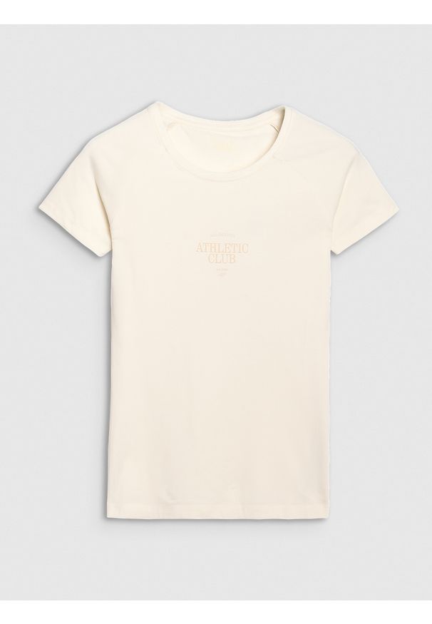 4f - 4F T-shirt regular z nadrukiem damski - beżowy L. Okazja: na co dzień. Kolor: beżowy. Materiał: tkanina, bawełna, materiał, dzianina, jersey. Długość rękawa: krótki rękaw. Długość: krótkie. Wzór: nadruk. Sezon: lato. Styl: klasyczny, casual, sportowy